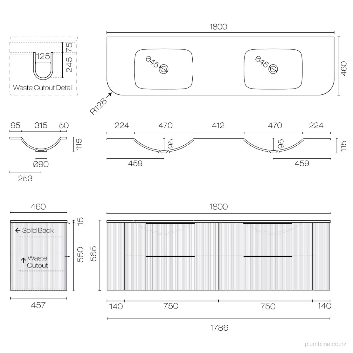 A beautiful combination of curves is formed when our latest vanity collection, Ava Curve, is paired with our signature Spio vanity top. A fine fluted profile, available in 12 modern thermoform colours with handles available to complement your vanity or tapware.