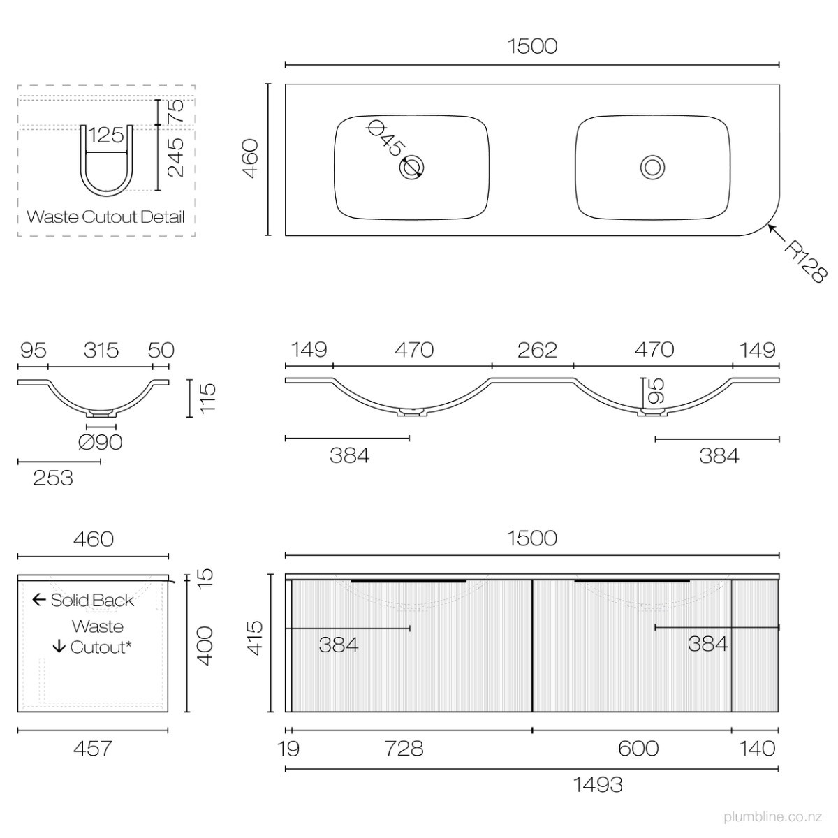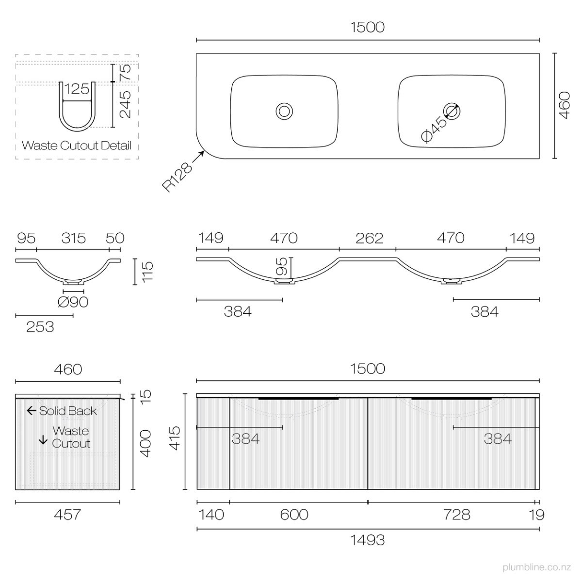 Ava Curve Spio 1500 Right Corner 2 Drawer Vanity Double Basin