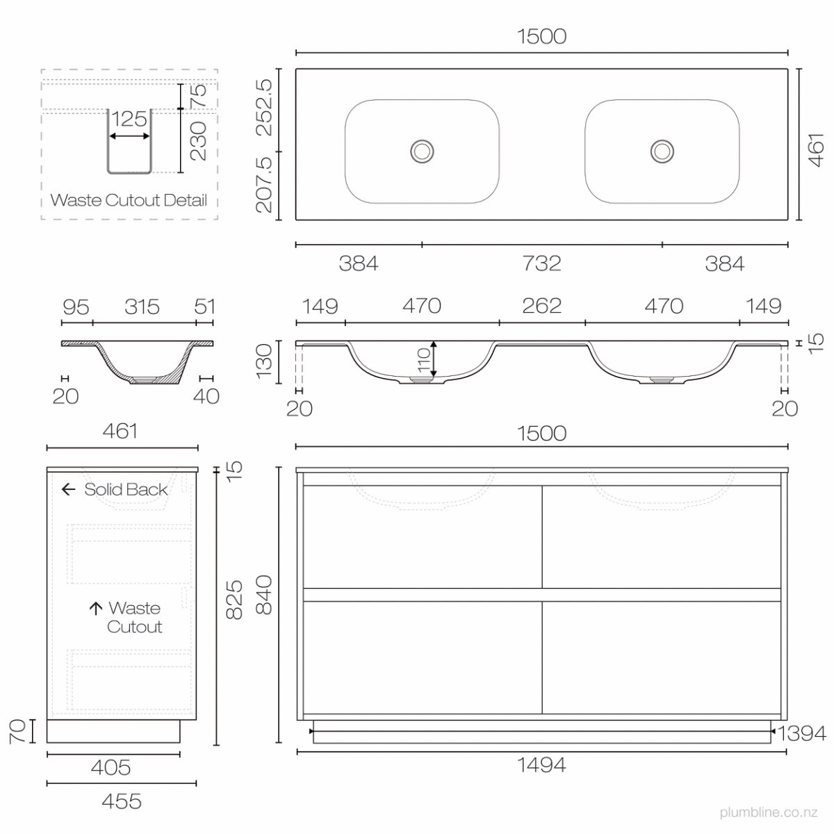 Prava Spio 1500 4 Drawer Floor Vanity Double Basin