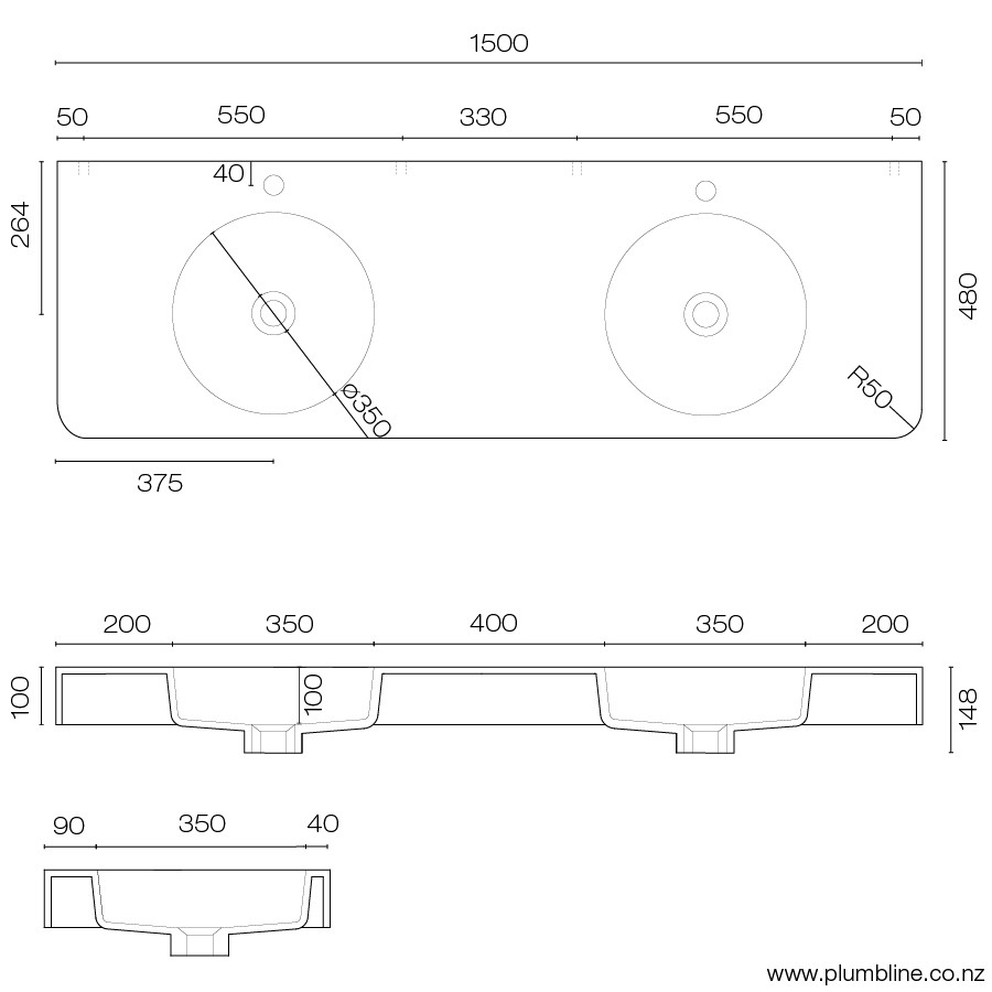 washbasin collection based on the 50mm radius corner which