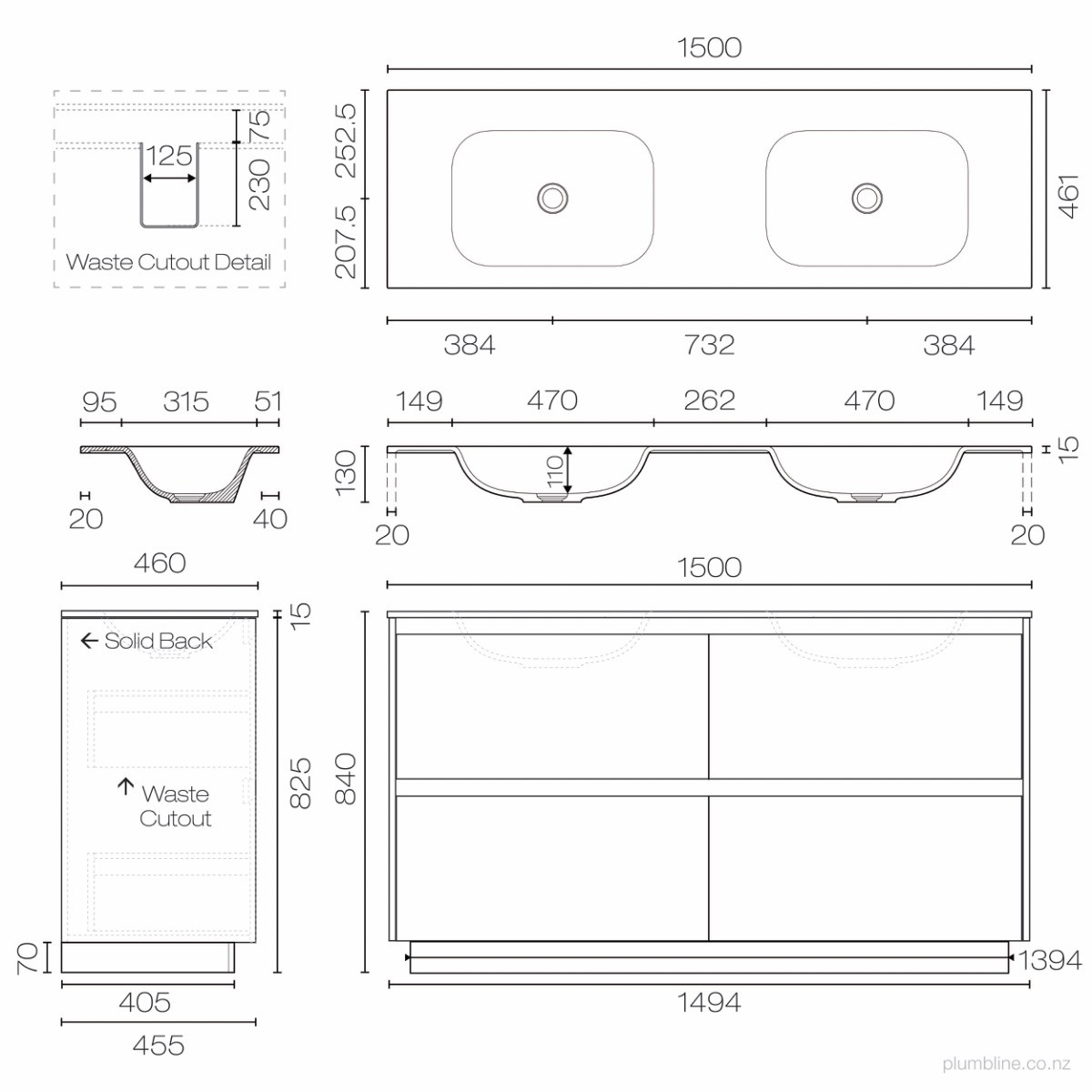 Stanza Spio 1500 4 Drawer Floor Vanity Double Basin