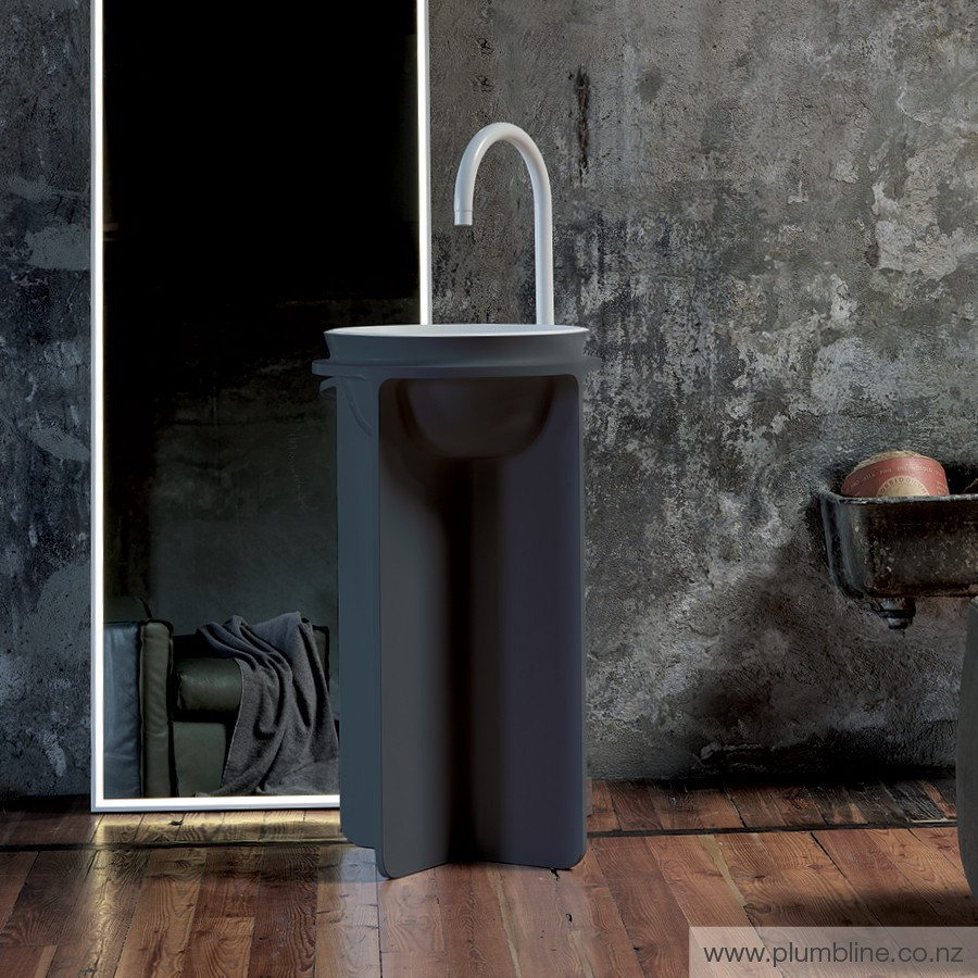 Designed by Dario Gaudio and Vittorio Venezia, winner of the Cristalplant Design Contest 2013, Controstampo draws inspiration from industrial objects and represents a new way to interpret the bathroom. Freestanding bathtub and sink, all made in Cristalplant Biobased® with an exclusive soft-touch grey finishing on the outer surfaces to accentuate the signs of an aesthetic that hides nothing.