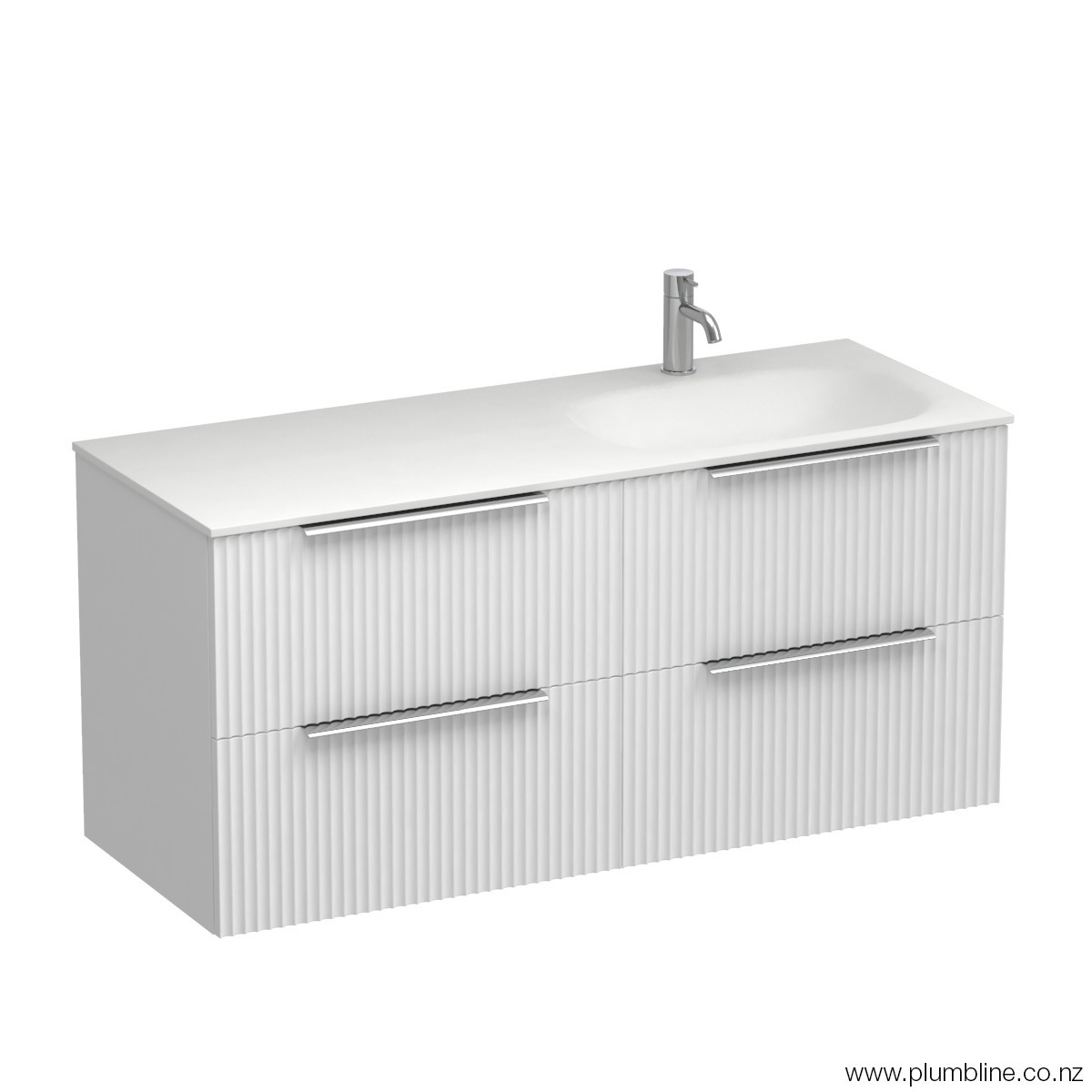 A collection inspired by the latest global trend of fluted finishes where the linear moulded Forma cabinetry is combined with the sleek contoured solid surface Spio basin. The drawers are offered in a variety of fashion colours and finished with a slimline handle in your choice of 7 colours. The Forma Spio collection will add texture and style to any new bathroom.