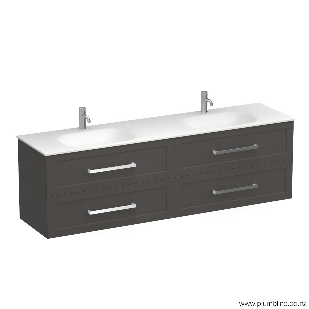 The beautifully contoured moulded solid surface Spio basin combined with the Hampton vanity. The grooved detailed drawers are offered in twelve on-trend colour options with the added versatility of selecting either handles or knobs. The Hampton Spio will suit any sophisticated bathroom.