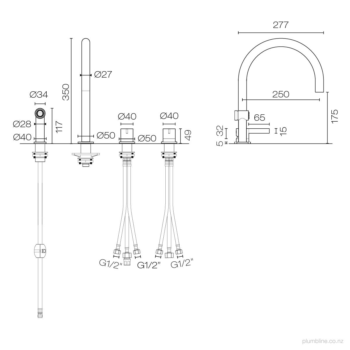 Arc 4 Hole Kitchen Mixer Straight Spout With Rinse Spray