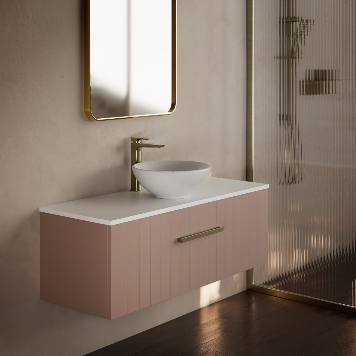 Modernity and versatility meet french country. The vertical linear detailing of the cabinetry is offered in the very latest European colours and finished with a solid surface top in either matt white, white cararra or concrete grey. Simply add your choice of any bench mounted or inset basin for the latest in European inspired bathroom furniture.