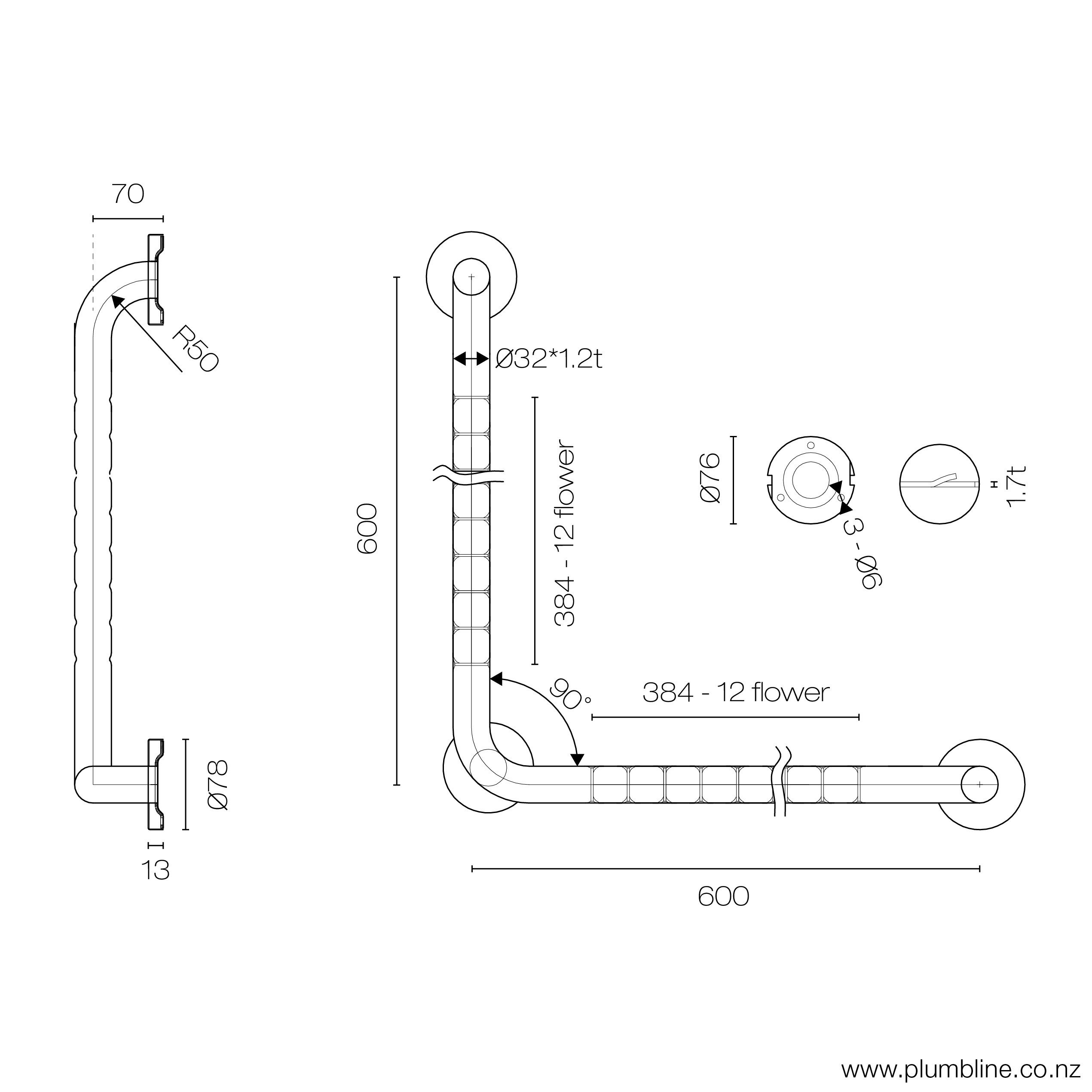 Plumbline Stainless Steel Grab Rail 600mm X 600mm X 90°