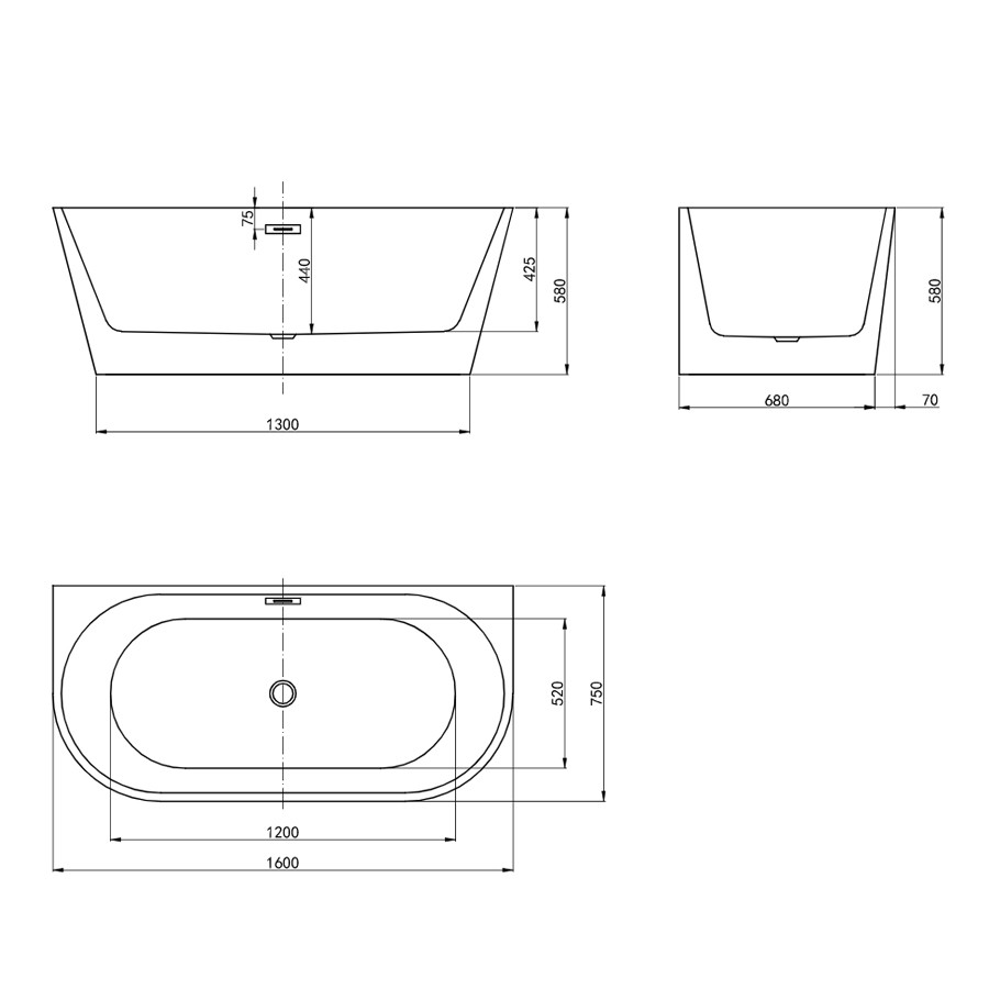 Tondo 1600 Back To Wall Bath with Overflow